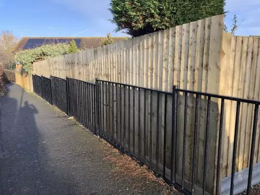 Close board fencing 6ft 6' next to metal railings (more privacy) And concrete post with gravel...